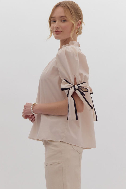 Solid Bow Tie Sleeve Blouse in Ecru