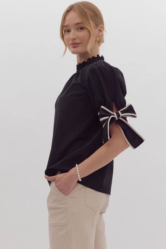 Solid Bow Tie Sleeve Blouse in Black